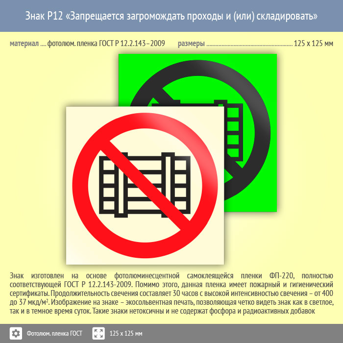 Знак P12 «Запрещается загромождать проходы и (или) складировать» (фотолюминесцентная пленка ГОСТ 34428-2018, 125х125 мм) в Ставрополе купить