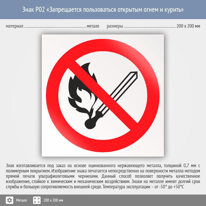 Знак P02 «Запрещается пользоваться открытым огнем и курить» (металл, 200х200 мм) в Ставрополе купить