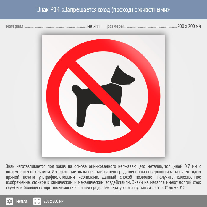 Знак P14 «Запрещается вход (проход) с животными» (металл, 200х200 мм) в Ставрополе купить