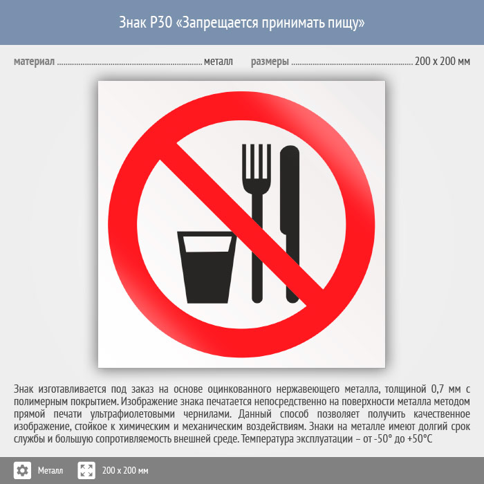 Знак P30 «Запрещается принимать пищу» (металл, 200х200 мм) в Ставрополе купить