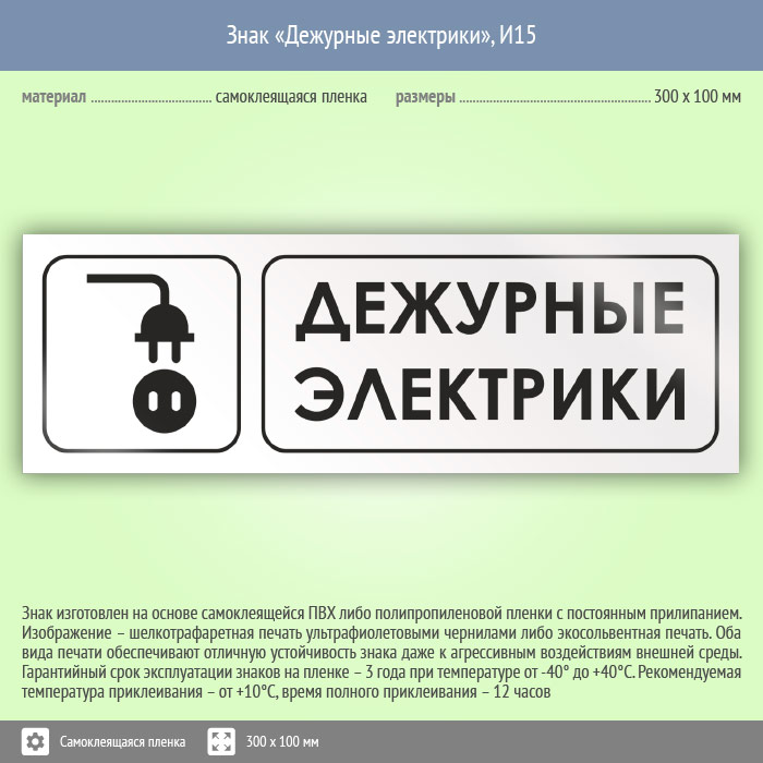 Знак «Дежурные электрики» может быть изготовлен любого размера на самоклеящейся пленке, пластике толщиной 0.5, 2 или 4 мм и металле. Также возможно применение фотолюминесцентных и световозвращающих материалов