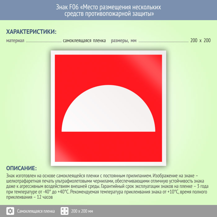 Знак F06 «Место размещения нескольких средств противопожарной защиты» (фотолюм. пленка, 200х200 мм)