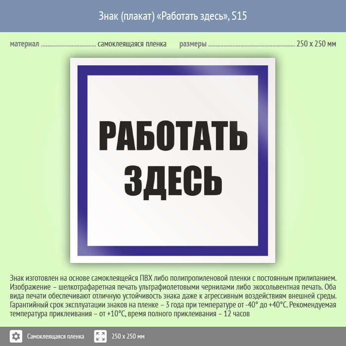 Знак (плакат) «Работать здесь», S15 (пленка, 100х100 мм)
