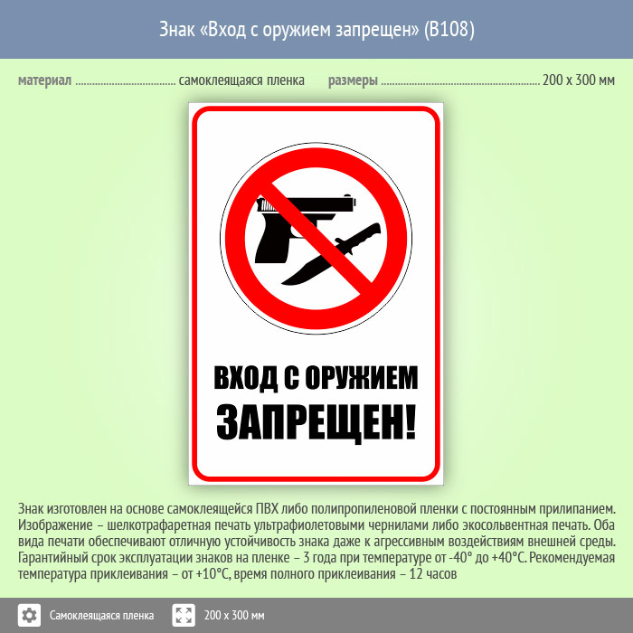 Знак «Вход с оружием запрещен», B108 (пленка, 200х300 мм)