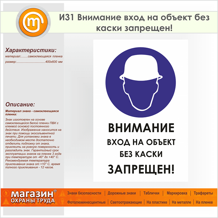 Знак «Внимание вход на объект без каски запрещен!», И31 (пленка, 400х600 мм)
