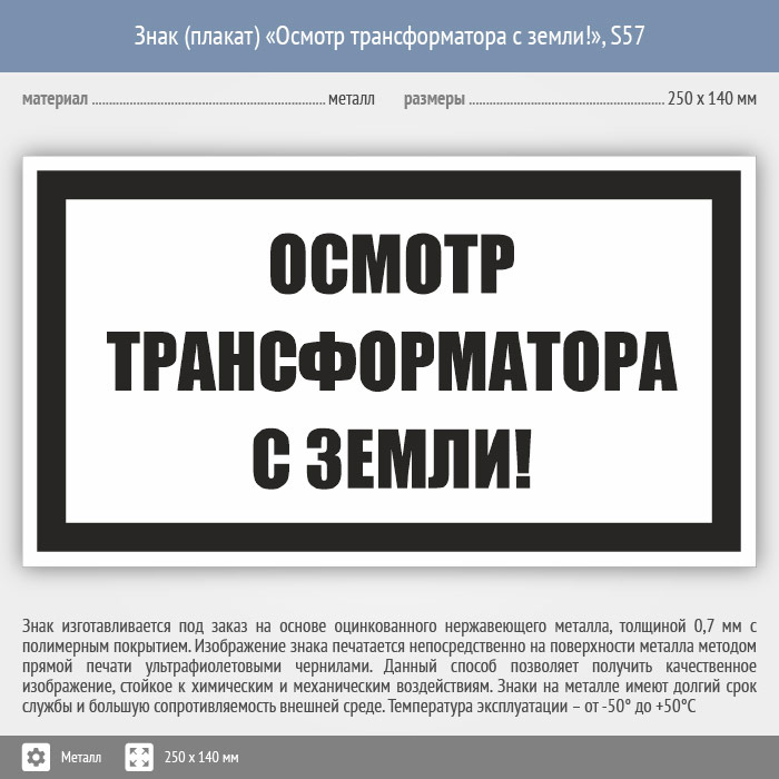 Знак (плакат) «Осмотр трансформатора с земли!», S57 (металл, 250х140 мм) в Ставрополе купить