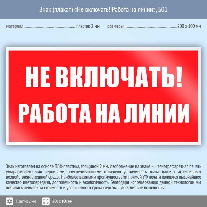 Знак (плакат) «Не включать! Работа на линии», S01 (пластик, 200х100 мм) в Ставрополе купить