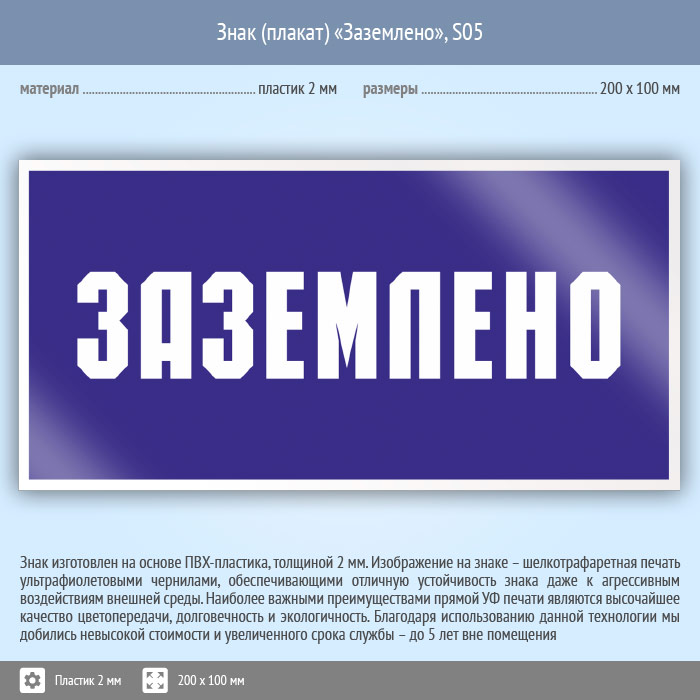 Знак (плакат) «Заземлено», S05 (пластик, 200х100 мм) в Ставрополе купить