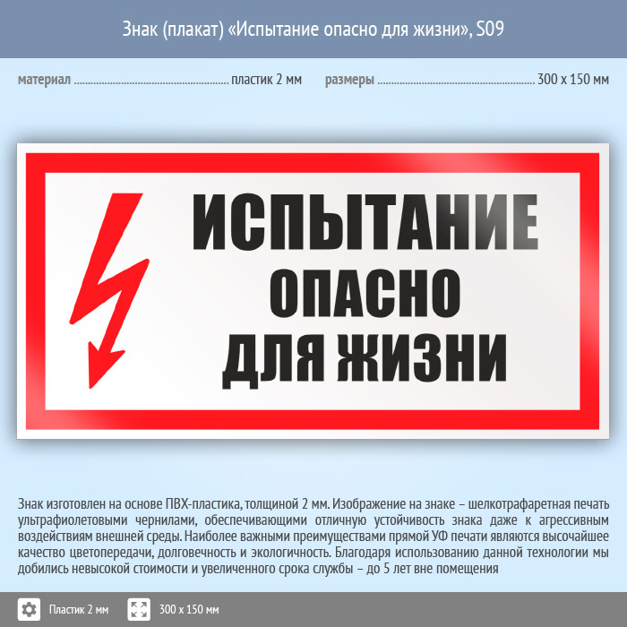 Знак (плакат) «Испытание опасно для жизни», S09 (пластик, 300х150 мм) в Ставрополе купить