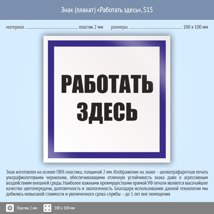 Знак (плакат) «Работать здесь», S15 (пластик, 100х100 мм) в Ставрополе купить