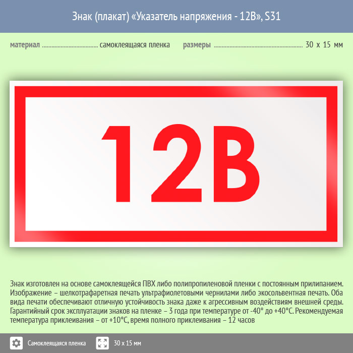 Знак (плакат) «Указатель напряжения 12 В», S31 (50 штук, пленка, 30х15 мм) в Ставрополе купить
