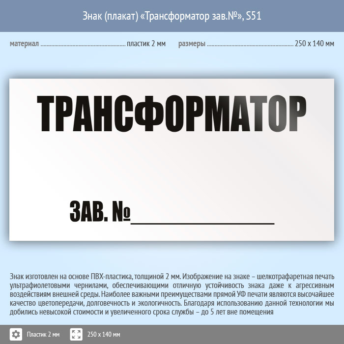 Знак (плакат) «Трансформатор зав.№», S51 (пластик, 250х140 мм) в Ставрополе купить