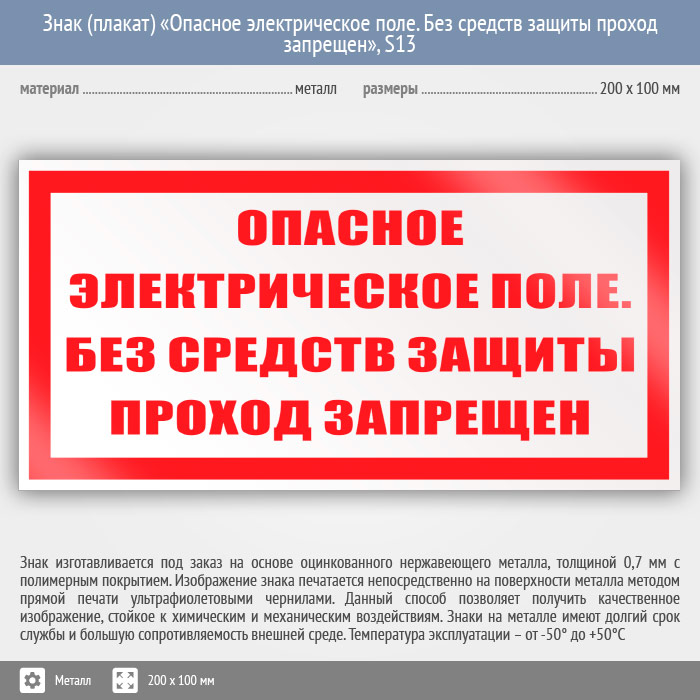 Знак (плакат) «Опасное электрическое поле. Без средств защиты проход запрещен», S13 (металл, 200х100 мм) в Ставрополе купить