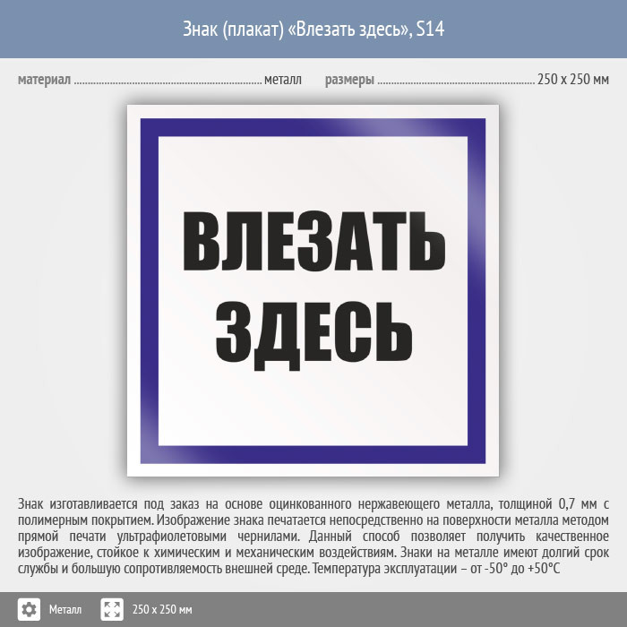 Знак (плакат) «Влезать здесь», S14 (металл, 250х250 мм) в Ставрополе купить
