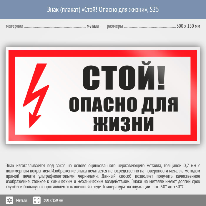 Знак (плакат) «Стой! Опасно для жизни», S25 (металл, 300х150 мм) в Ставрополе купить