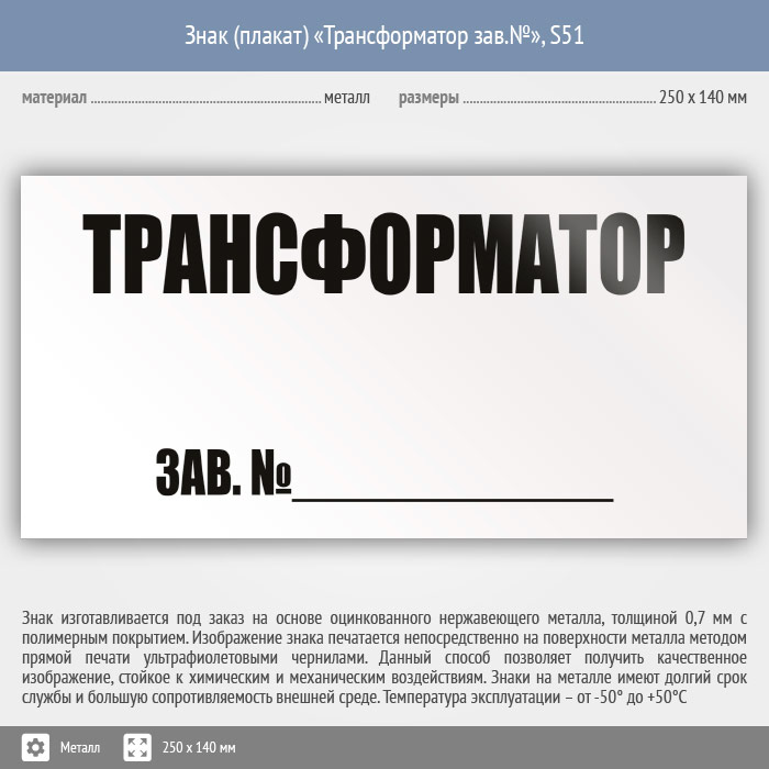 Знак (плакат) «Трансформатор зав.№», S51 (металл, 250х140 мм) в Ставрополе купить