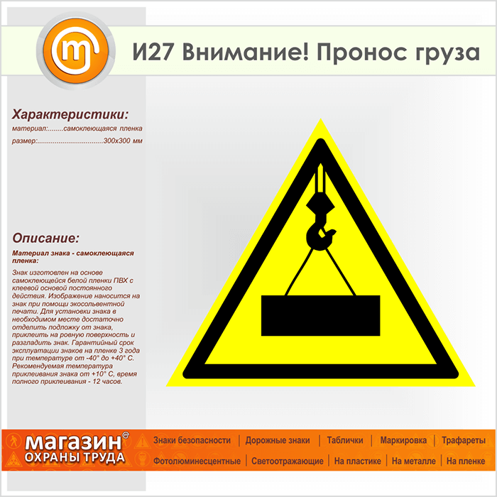 Знак «Внимание! Пронос груза», И27 (пленка, сторона 300 мм) в Ставрополе купить
