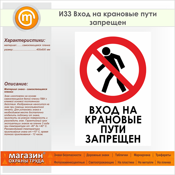 Знак «Вход на крановые пути запрещен», И33 (пленка, 400х600 мм) в Ставрополе купить