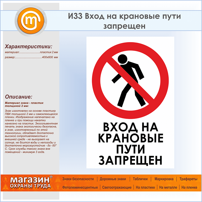 Знак «Вход на крановые пути запрещен», И33 (пластик, 400х600 мм) в Ставрополе купить