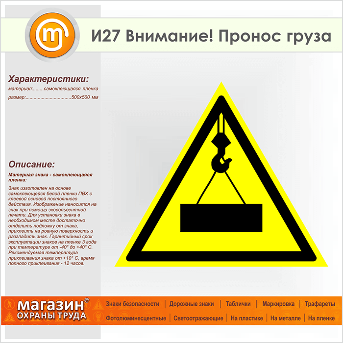 Знак «Внимание! Пронос груза», И27 (пленка, сторона 500 мм) в Ставрополе купить