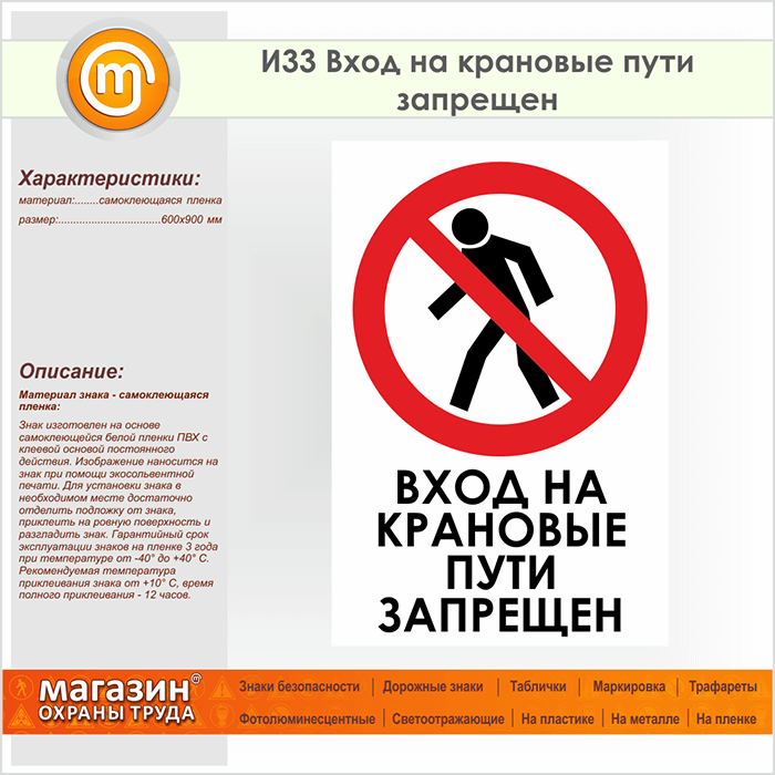 Знак «Вход на крановые пути запрещен», И33 (пленка, 600х900 мм) в Ставрополе купить