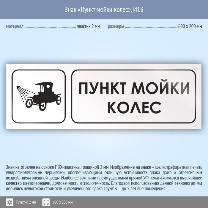 Знак «Пункт мойки колес», И13 (пластик, 600х200 мм) в Ставрополе купить