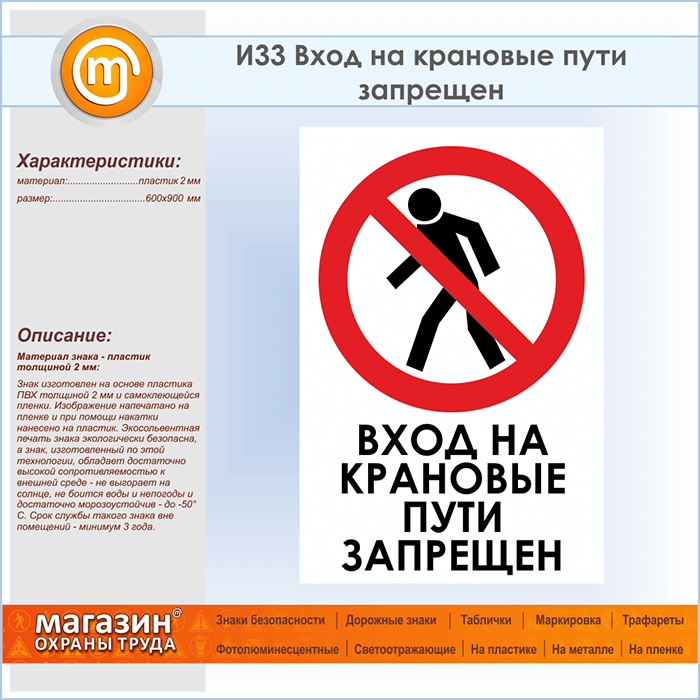 Знак «Вход на крановые пути запрещен», И33 (пластик, 600х900 мм) в Ставрополе купить