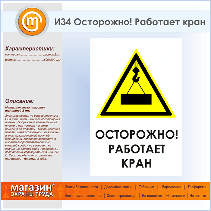 Знак «Осторожно! Работает кран», И34 (пластик, 600х900 мм) в Ставрополе купить