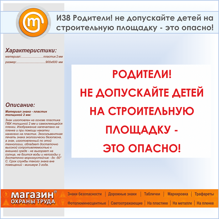 Знак «Родители! не допускайте детей на строительную площадку - это опасно!», И38 (пластик, 900х600 мм) в Ставрополе купить