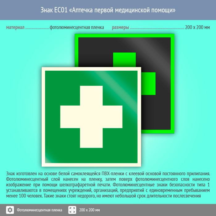 Знак EC01 «Аптечка первой медицинской помощи» (фотолюминесцентная пленка, 200х200 мм) в Ставрополе купить