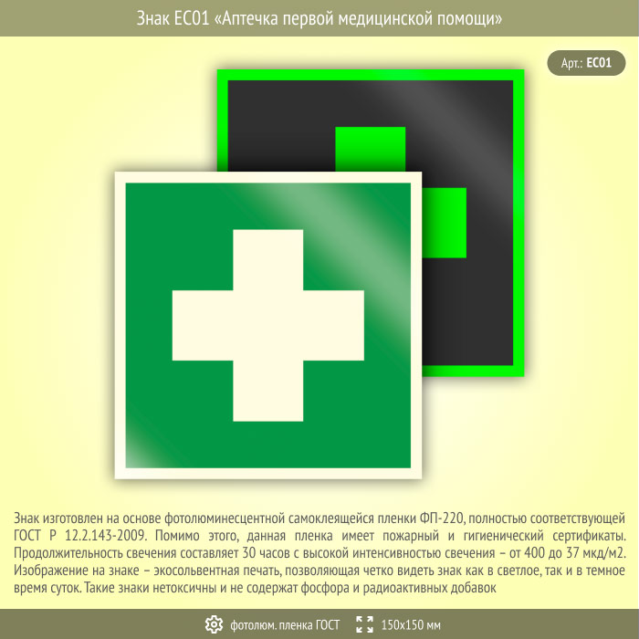 Знак EC01 «Аптечка первой медицинской помощи» (фотолюминесцентная пленка ГОСТ 34428-2018, 150х150 мм) в Ставрополе купить