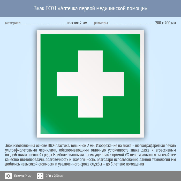 Знак EC01 «Аптечка первой медицинской помощи» (пластик, 200х200 мм) в Ставрополе купить