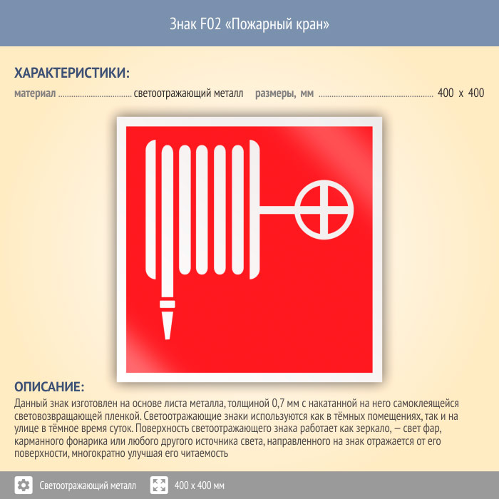 Знак F02 «Пожарный кран» (светоотражающий металл, 400х400 мм) в Ставрополе купить