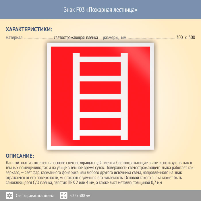 Знак F03 «Пожарная лестница» (светоотражающая пленка, 300х300 мм) в Ставрополе купить