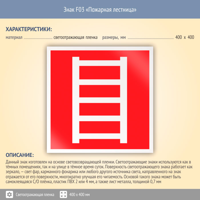 Знак F03 «Пожарная лестница» (светоотражающая пленка, 400х400 мм) в Ставрополе купить