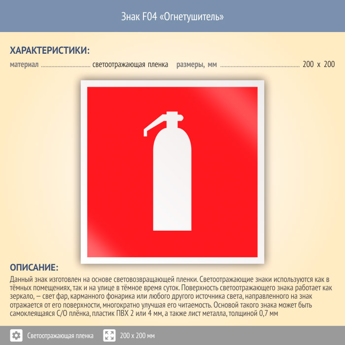 Знак F04 «Огнетушитель» (светоотражающая пленка, 200х200 мм) в Ставрополе купить