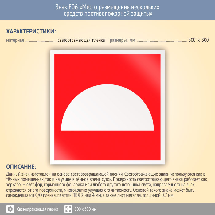 Знак F06 «Место размещения нескольких средств противопожарной защиты» (светоотражающая пленка, 300х300 мм) в Ставрополе купить