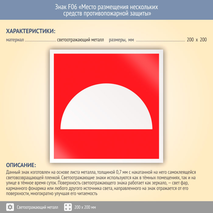Знак F06 «Место размещения нескольких средств противопожарной защиты» (светоотражающий металл, 200х200 мм) в Ставрополе купить