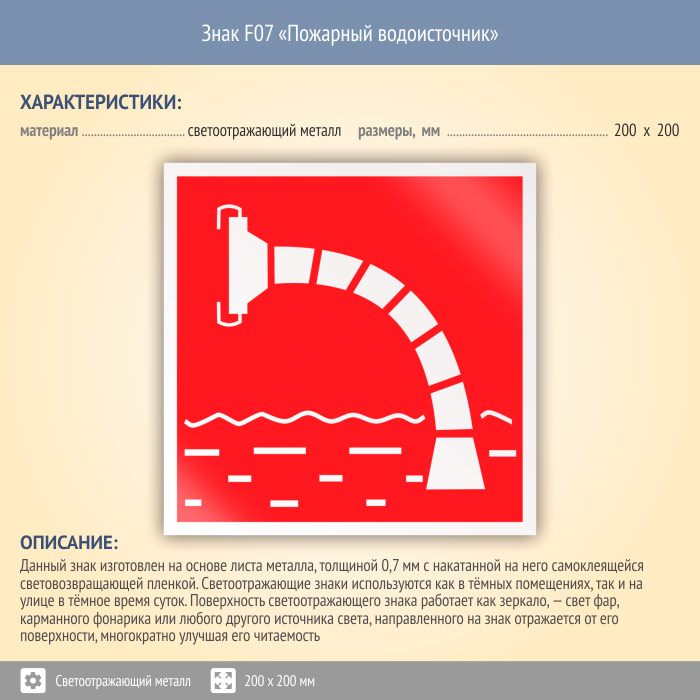 Знак F07 «Пожарный водоисточник» (светоотражающий металл, 200х200 мм) в Ставрополе купить
