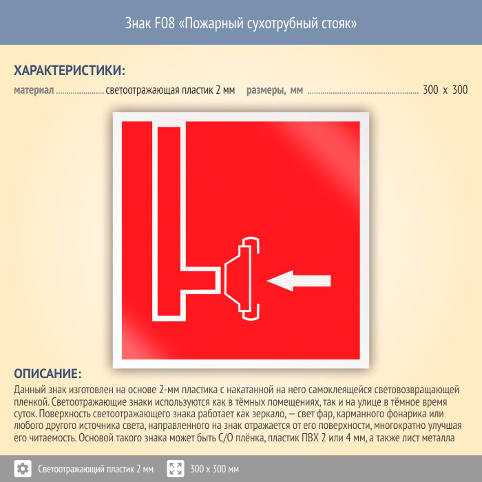 Знак F08 «Пожарный сухотрубный стояк» (светоотражающий пластик, 300х300 мм) в Ставрополе купить