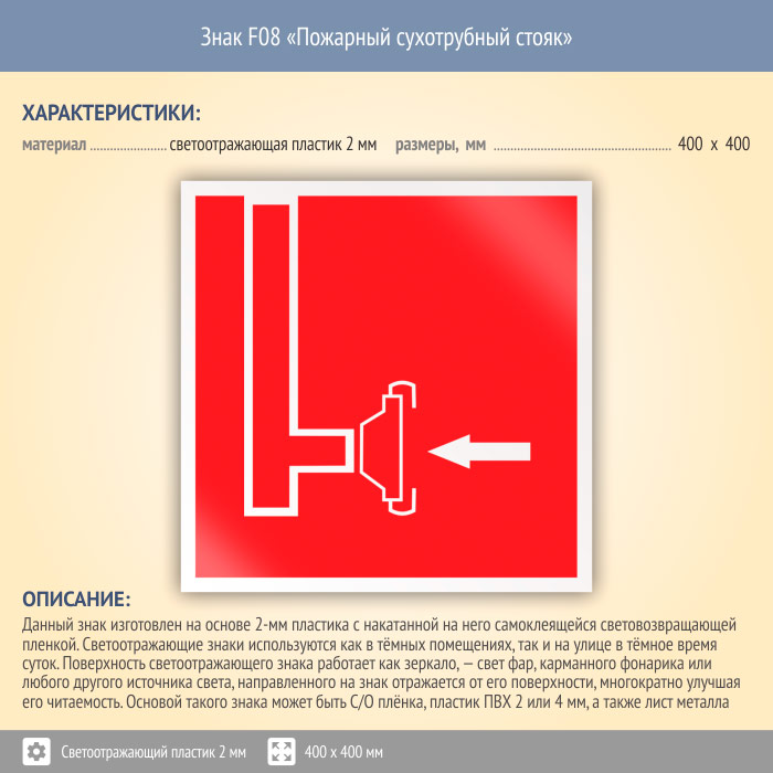 Знак F08 «Пожарный сухотрубный стояк» (светоотражающий пластик, 400х400 мм) в Ставрополе купить