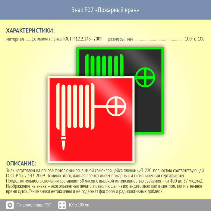 Знак F02 «Пожарный кран» (фотолюминесцентная пленка ГОСТ 34428-2018, 100х100 мм) в Ставрополе купить