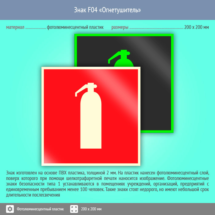Знак F04 «Огнетушитель» (фотолюминесцентный пластик, 200х200 мм) в Ставрополе купить