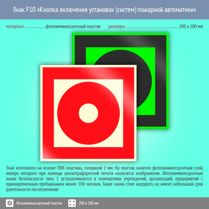 Знак F10 «Кнопка включения установок (систем) пожарной автоматики» (фотолюминесцентный пластик, 200х200 мм) в Ставрополе купить