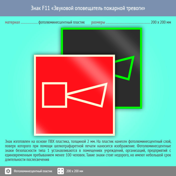 Знак F11 «Звуковой оповещатель пожарной тревоги» (фотолюминесцентный пластик, 200х200 мм) в Ставрополе купить