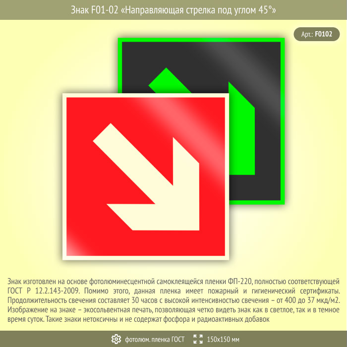 Знак F01-02 «Направляющая стрелка под углом 45°» (фотолюминесцентная пленка ГОСТ 34428-2018, 150х150 мм) в Ставрополе купить