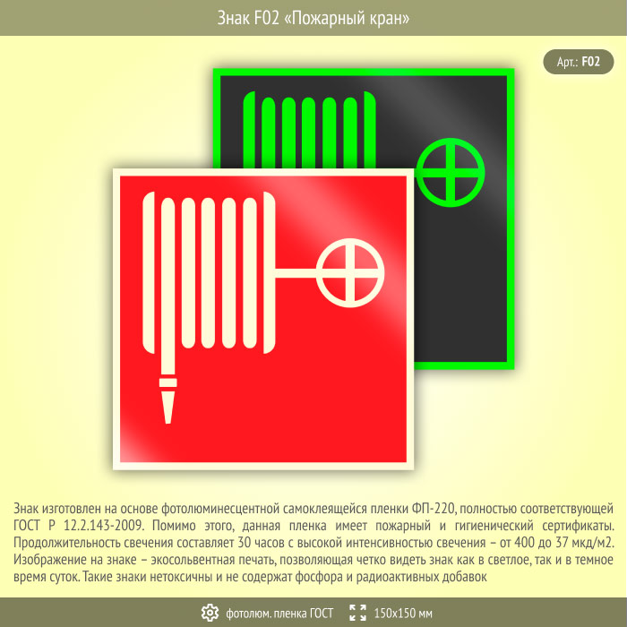 Знак F02 «Пожарный кран» (фотолюминесцентная пленка ГОСТ 34428-2018, 150х150 мм) в Ставрополе купить