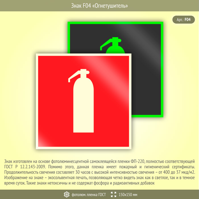 Знак F04 «Огнетушитель» (фотолюминесцентная пленка ГОСТ 34428-2018, 150х150 мм) в Ставрополе купить