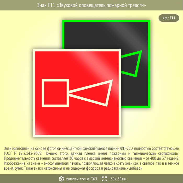 Знак F11 «Звуковой оповещатель пожарной тревоги» (фотолюминесцентная пленка ГОСТ 34428-2018, 150х150 мм) в Ставрополе купить