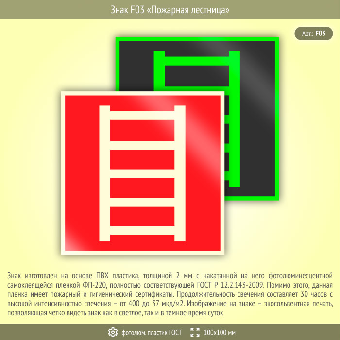 Знак F03 «Пожарная лестница» (фотолюминесцентный пластик ГОСТ 34428-2018, 100х100 мм) в Ставрополе купить